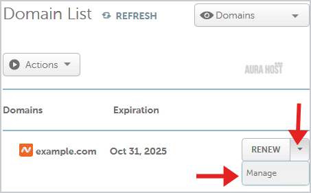 3. Under domain list, You can see list of your domains. In front of your domain click on dropdown menu and select "Manage".