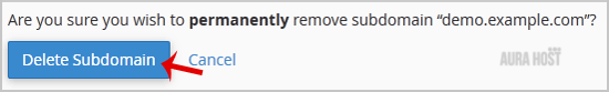 5. You will receive a warning that you are removing a "subdomain.example.com". You will need to click on the "Delete Subdomain" button to remove your subdomain permanently.