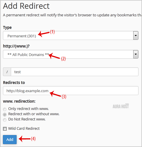 3. Under "Add Redirect" you should enter the following details and chose the appropriate option.