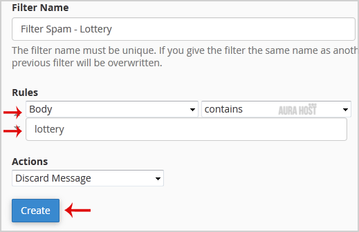 5. In the rules of the filter you can filter e-mail by many options, and should you want to deal with e-mail which contains a word like "Lottery" or other words, then select "Contains" under the "Rules" list, select "Body" from the dropdown list and from the 2nd drop down list.