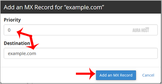 3. Click on the "MX Record" and a small window will open. Enter the required details in it.