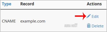 4. Locate CNAME Record you wish to edit or remove. Should you wish to edit a CNAME record, click the "Edit" option, modify the details and then click on "Save Record". Removing a record can be done with the "Delete" option.