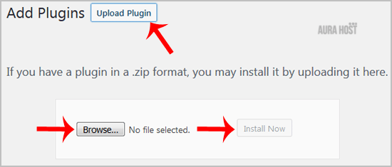 3. Click on "Upload Plugin" and then on "Browse". Chose your plugin"s zip file and then click on "Install Now".